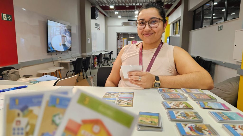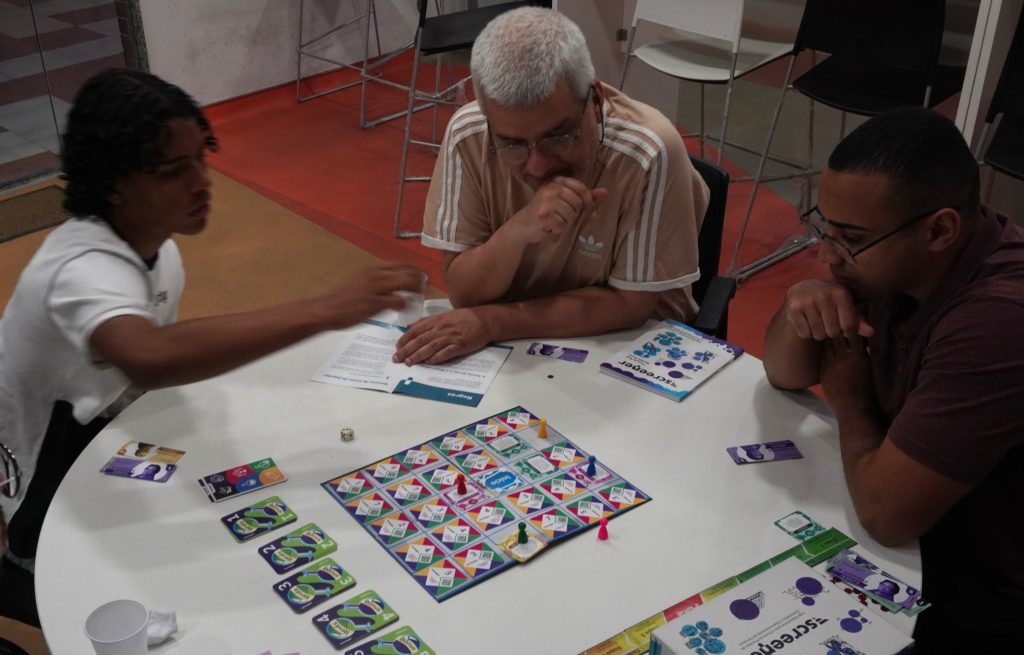 meio da manipulação de peças físicas. As cartas com perguntas e respostas abrangem conteúdos como matemática, biologia, física e química, promovendo a aprendizagem de forma lúdica, interativa e acessível. O jogo